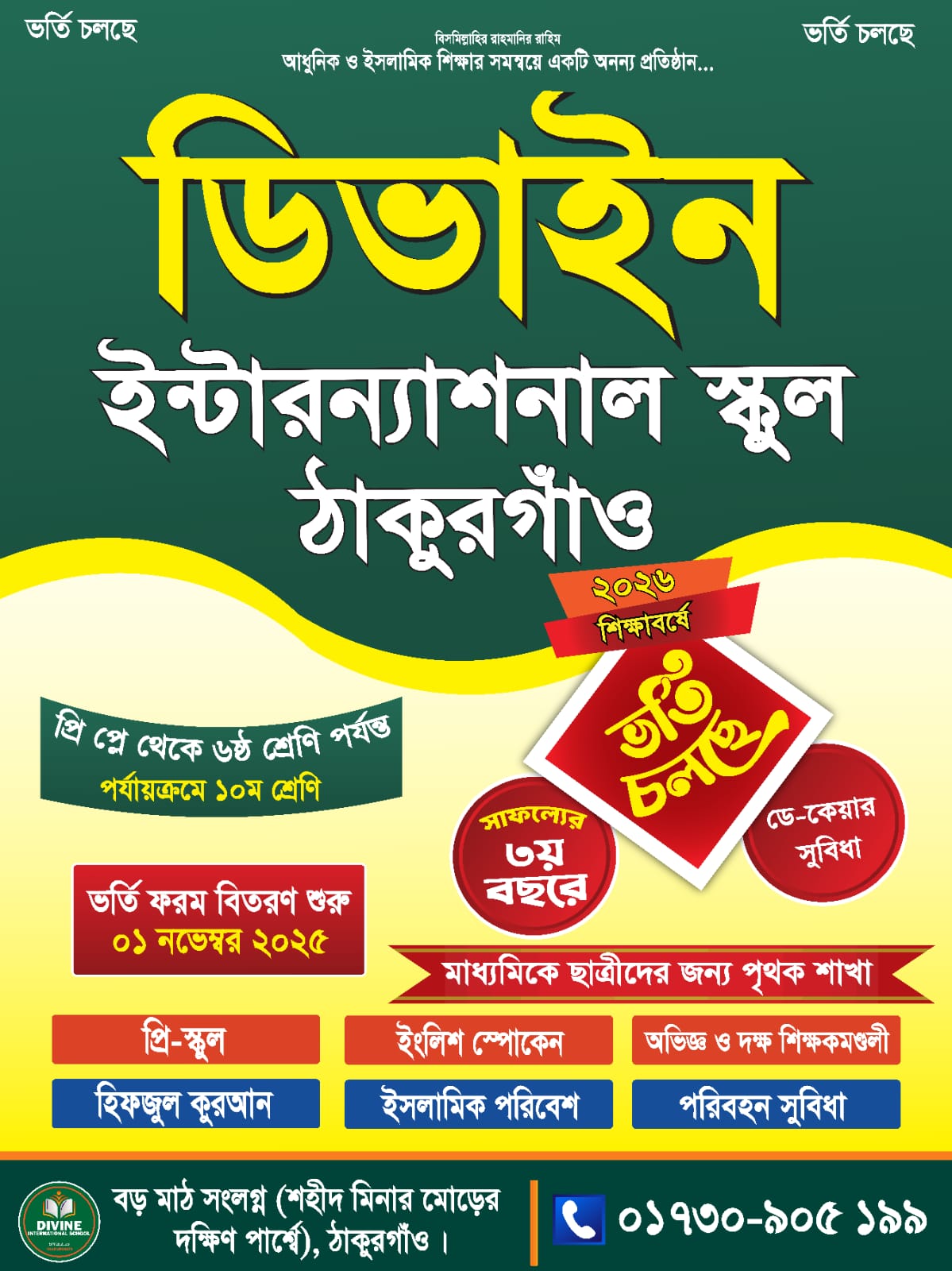 শুরুতেই আমি মহান আল্লাহ্ রাব্বুল আলামীনের প্রশংসা করছি, যিনি আমাদেরকে ধর্মীয় ও সাধারণ শিক্ষার সমন্বয়ে একটি প্রতিষ্ঠান গড়ে তোলার তাওফীক দান করেছেন। ঠাকুরগাঁও শহরে এমন সমন্বিত সিলেবাসের আলোকে ডিভাইন ইন্টারন্যাশনাল স্কুলই প্রথম স্কুল।